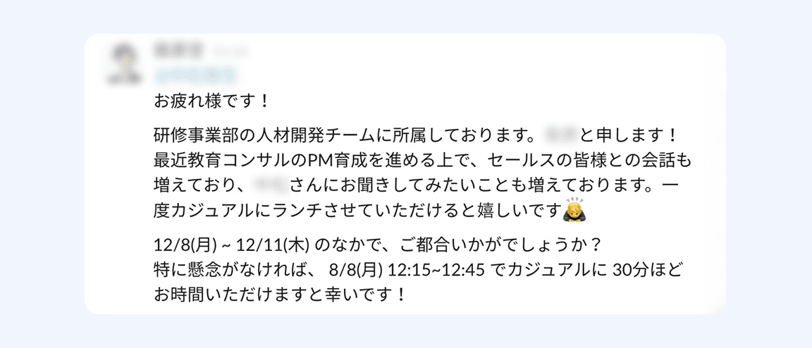 部門や職種を問わず、Slackで気軽にランチに誘い合えるスレッドです。普段関わりの少ないメンバー同士でも自然に交流が生まれ、新しいアイデアや協力関係のきっかけとなっています。