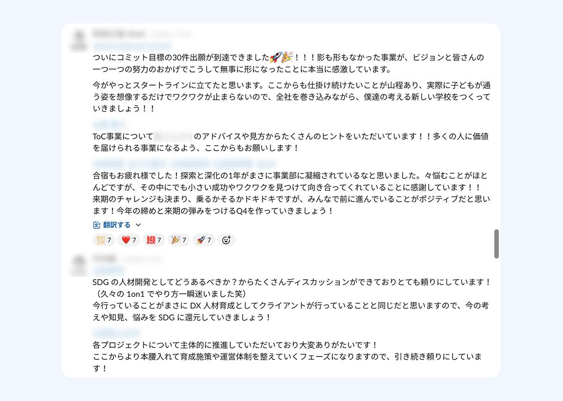 Slackの専用スレッドで、メンバー同士がお互いの頑張りや貢献に感謝を伝え合う文化です。日々の小さな協力から大きなプロジェクトの成果まで、チーム全体でお互いを認め合い、支え合う雰囲気を作っています。